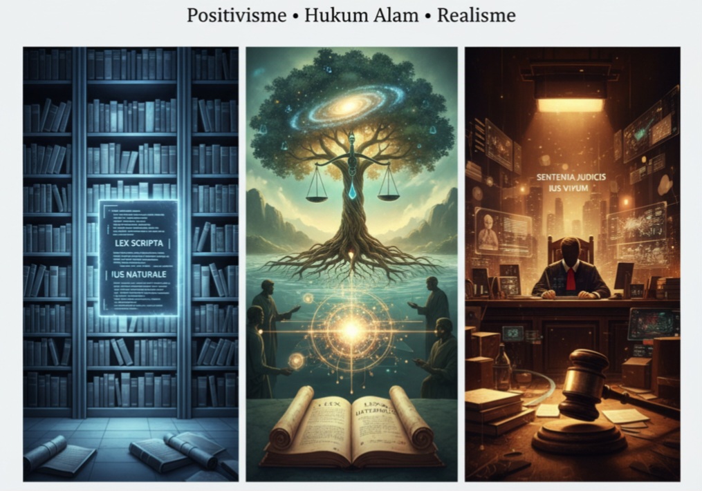 Ketiga teori ini – Positivisme, Hukum Alam, dan Realisme – merepresentasikan spektrum pemikiran yang luas tentang hakikat hukum. Positivisme memberikan fondasi yang jelas dan empiris, berfokus pada hukum sebagai sistem aturan yang sah. Hukum Alam menawarkan dimensi moral dan etika, menegaskan bahwa hukum yang benar harus adil dan sesuai dengan akal sehat. Sementara itu, Realisme membawa perspektif praktis dan skeptis, mengingatkan kita bahwa hukum dalam praktiknya adalah hasil dari tindakan manusia yang kompleks.